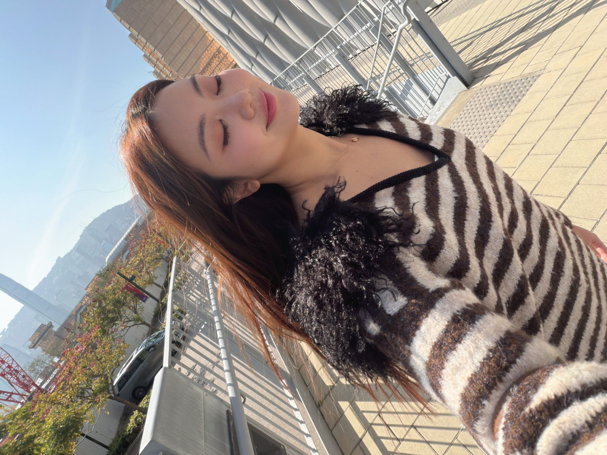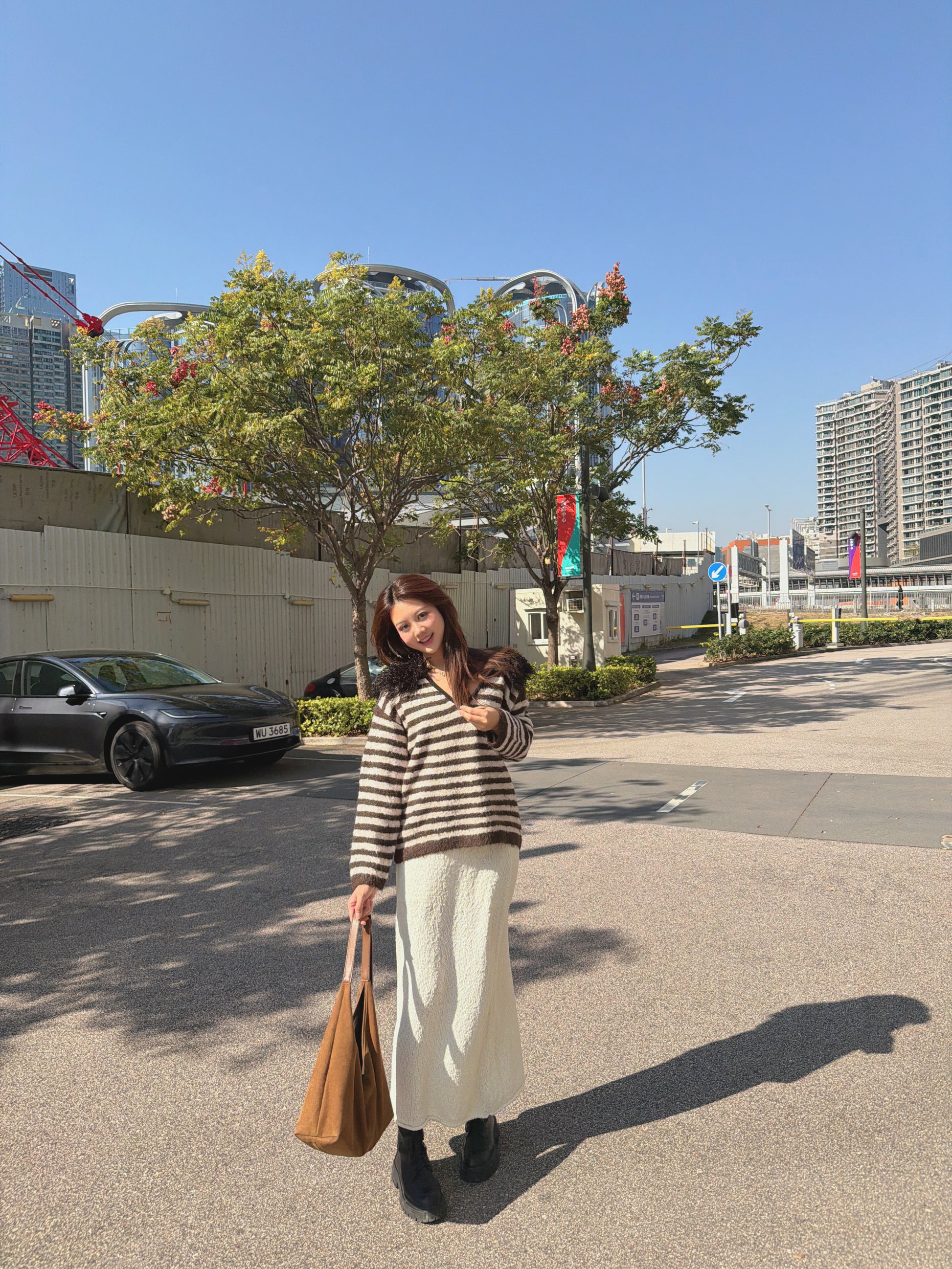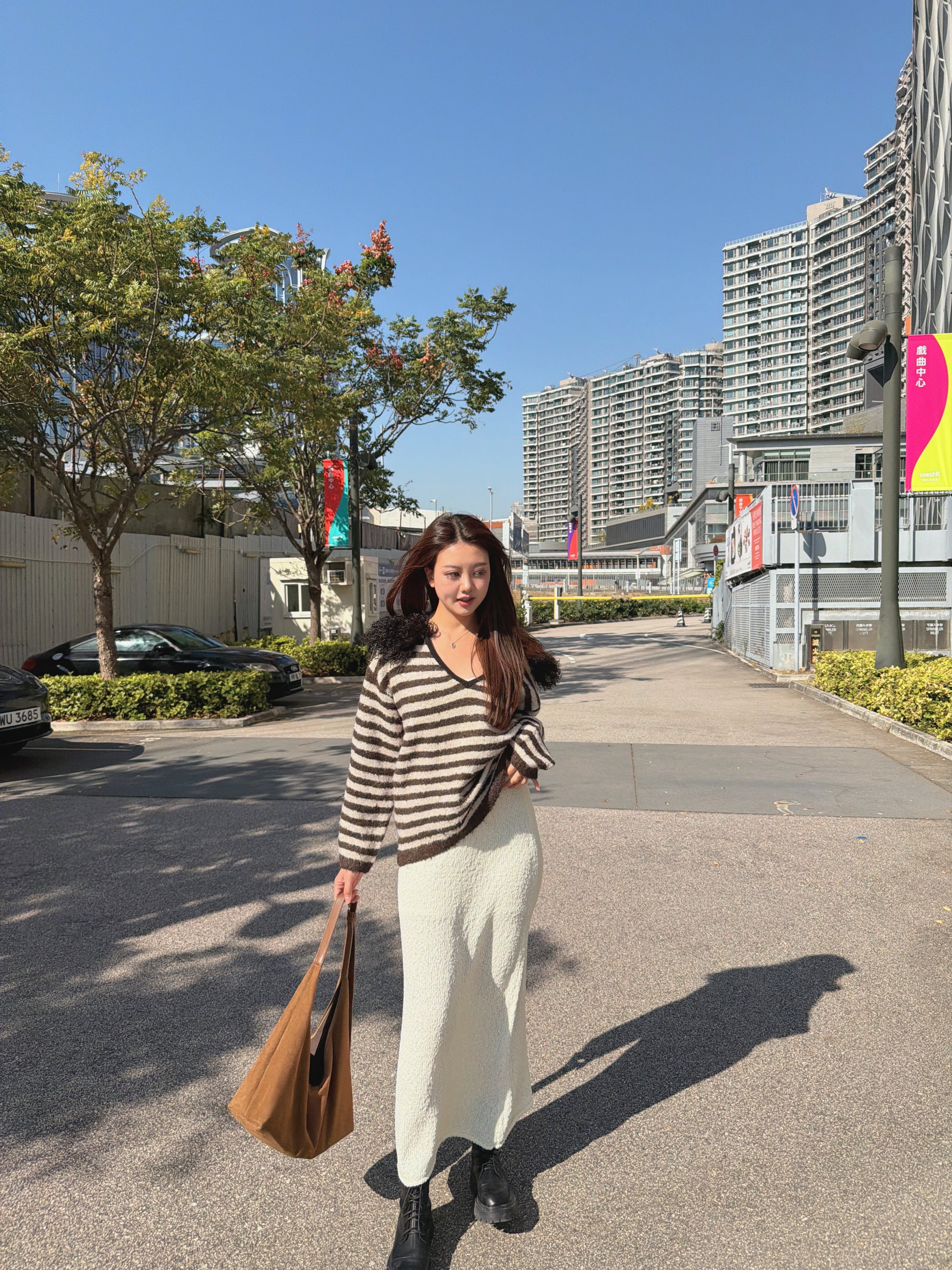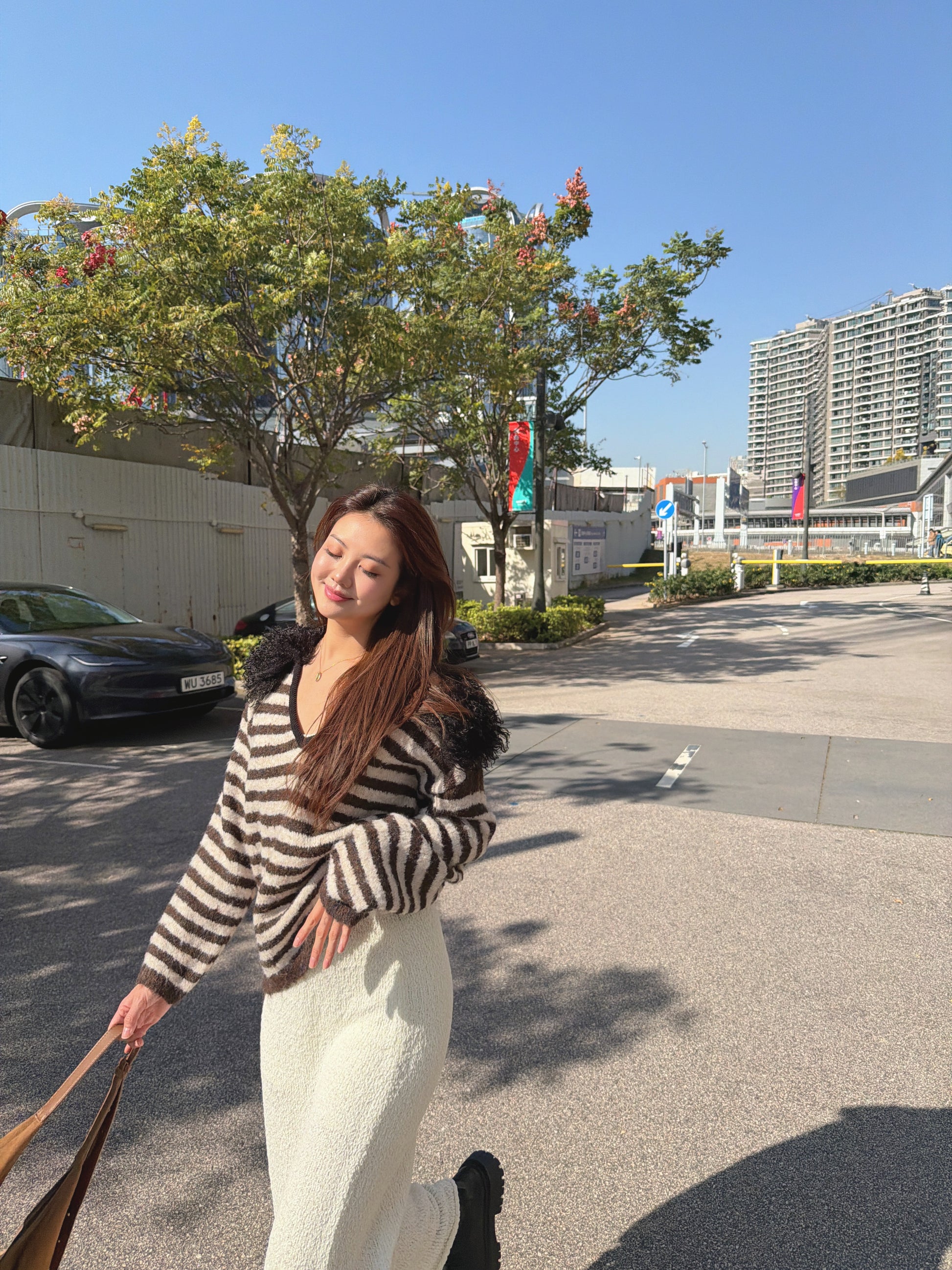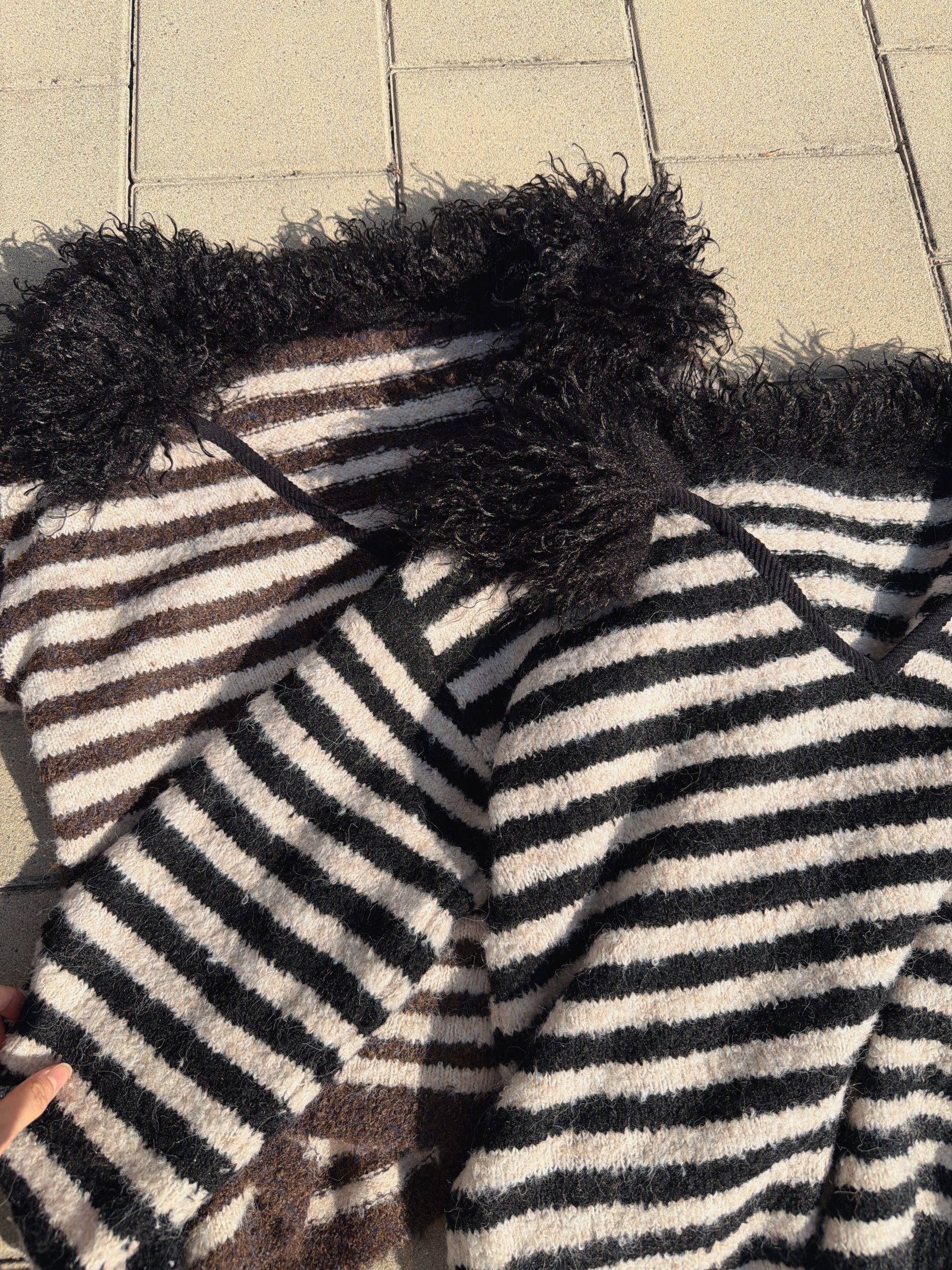 毛毛V領間條針織冷衫(黑/啡)