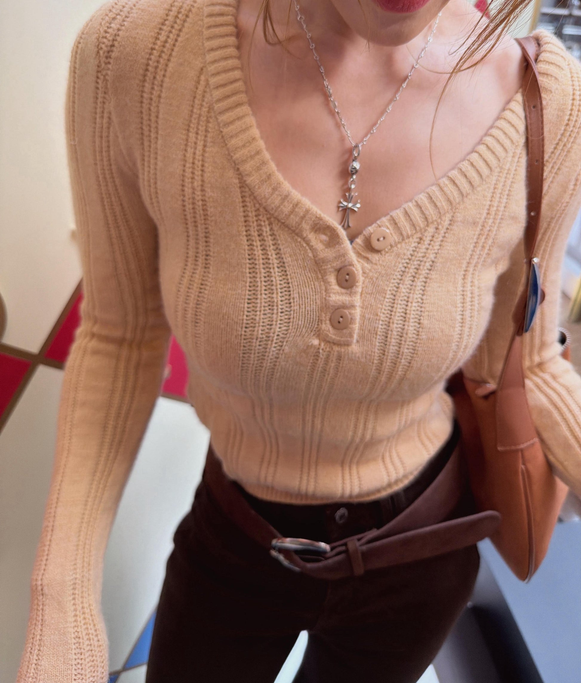 超顯瘦歐美V領針織上衣(溫柔奶茶)