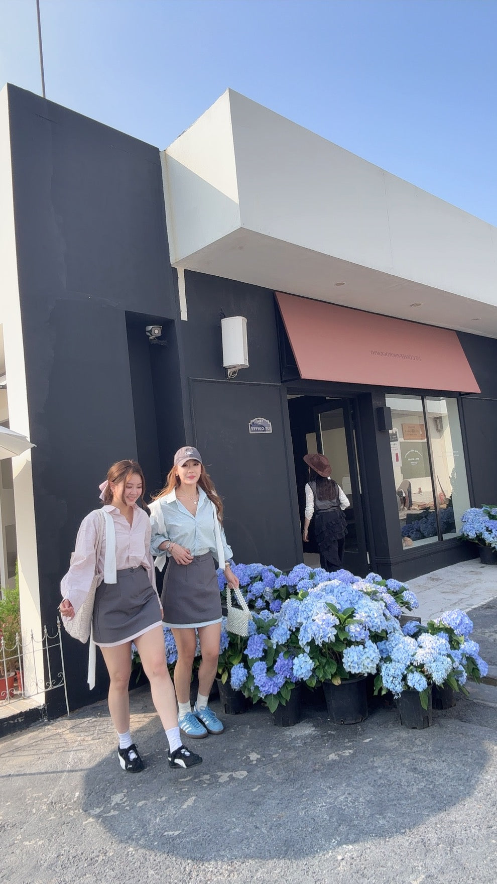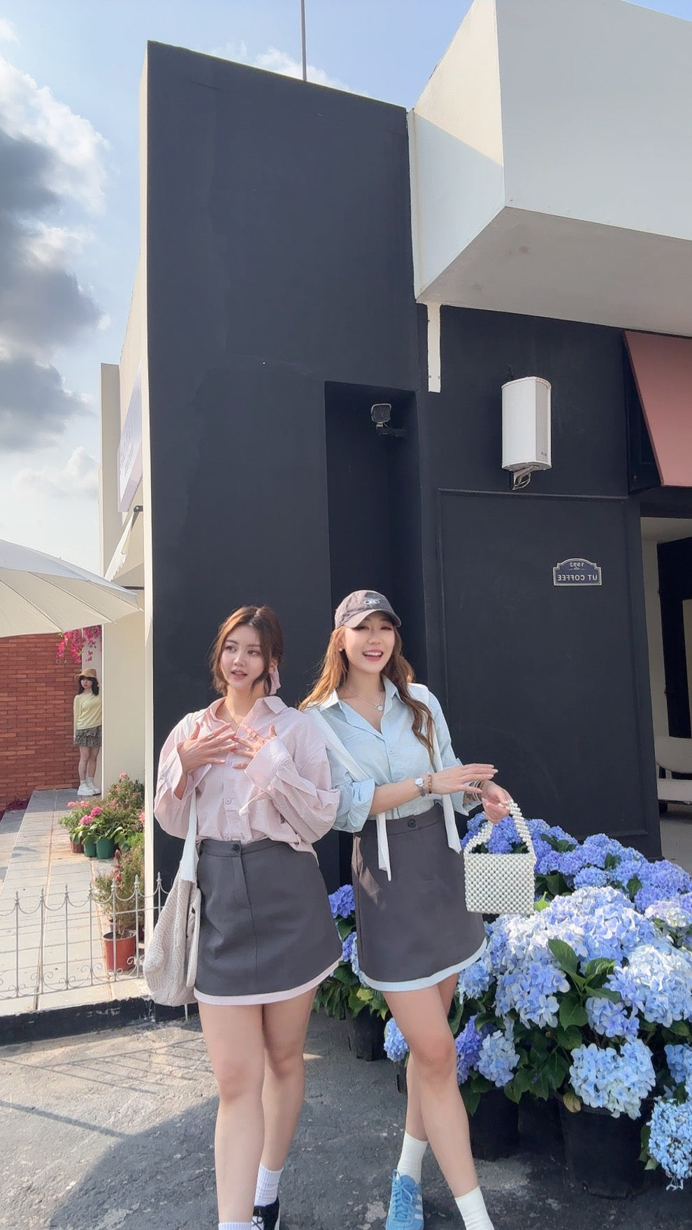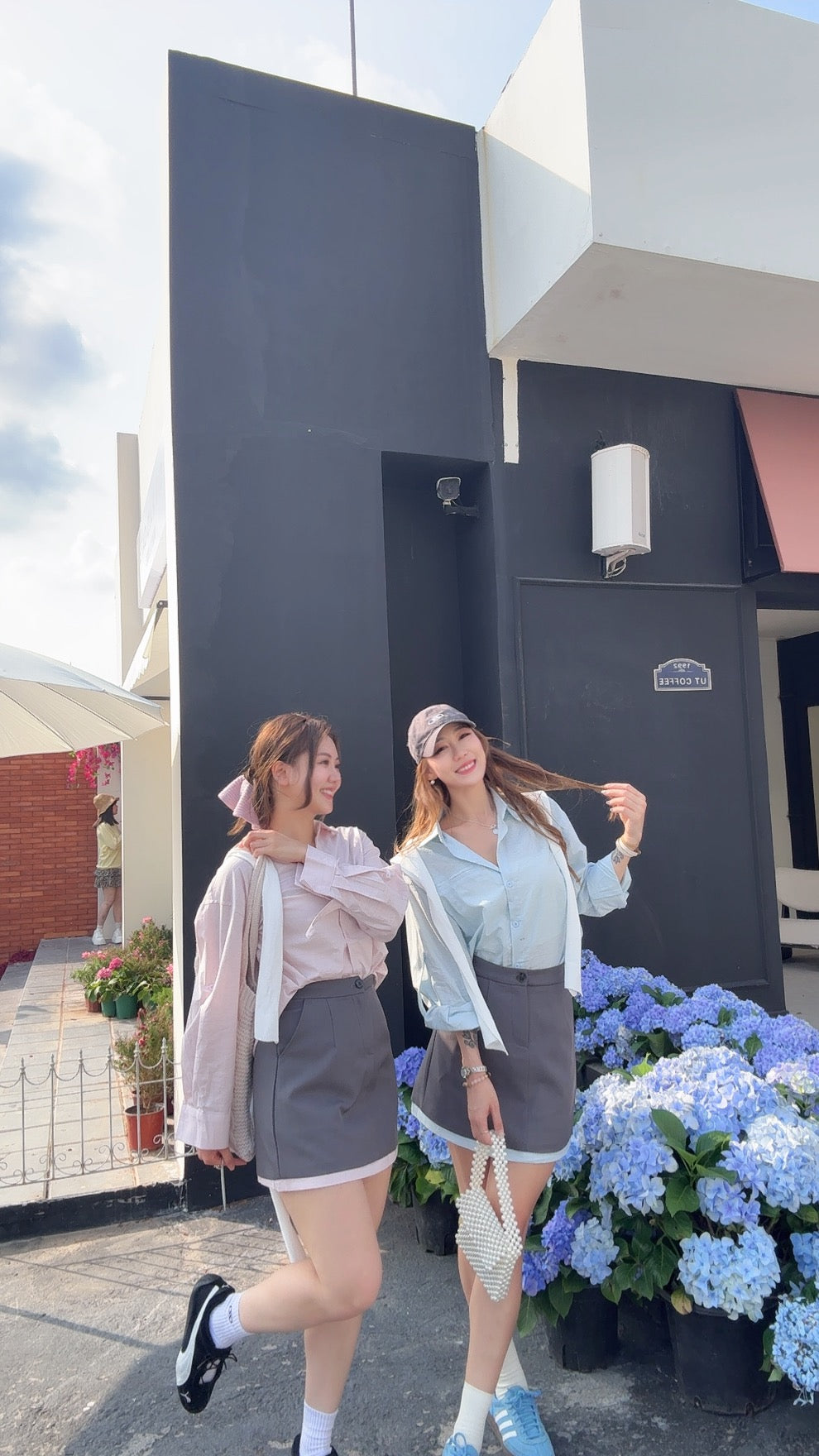 CU-清新學院風恤衫+高腰裙套裝(藍/粉)